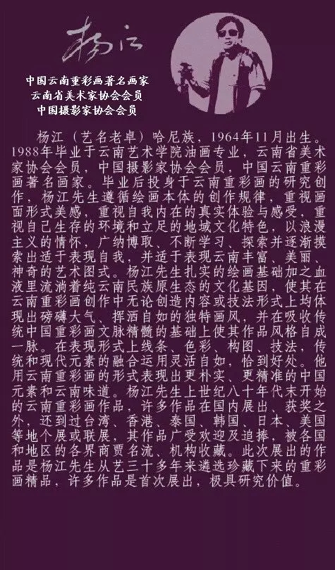 由云南省美术家协会重彩画艺委会、云南摩太艺术文化产业有限公司联合主办,云南昴能生物科技有限公司承办,云南围棋厂、昆明莲庄广告有限公司协办的杨江云南重彩画精品展于2016年1月19日-2月19日在官渡古镇云子棋院开展。
