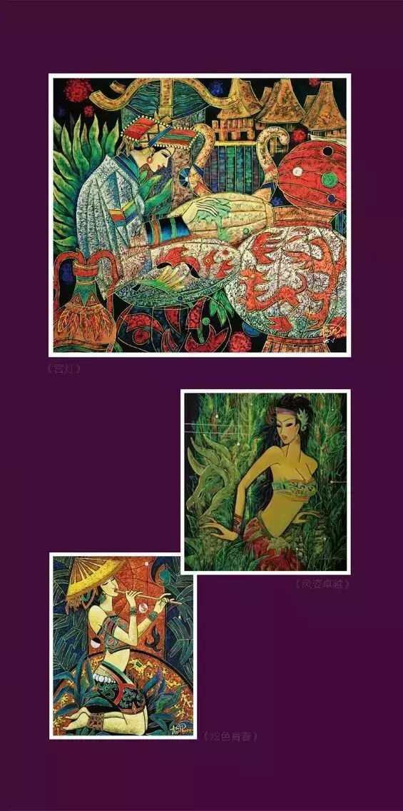 云南重彩画是最具民族民间特色的艺术画种,它发源于云南,在全国及世界都具有一定影响力。对重彩画这一特色画种进行展览具有重要的意义,此次精品展主题渊源与传承,展出中国云南重彩画著名画家杨江的多幅佳作,曾有人这样评价杨江先生的画,看到他的画耳边不由得响起那支悠婉的云南民歌:“有一个美丽的地方哟,咱傣族人民在那里生长哟,密密的寨子紧紧相连,那弯弯的江水碧波荡漾……”是啊,云南美,美得清新,美得古朴,美得妖娆!因为美丽,就少不了美的讴歌者。我们可以从杨江先生的一系列重彩画中解读云南的美丽景致和风土人情。